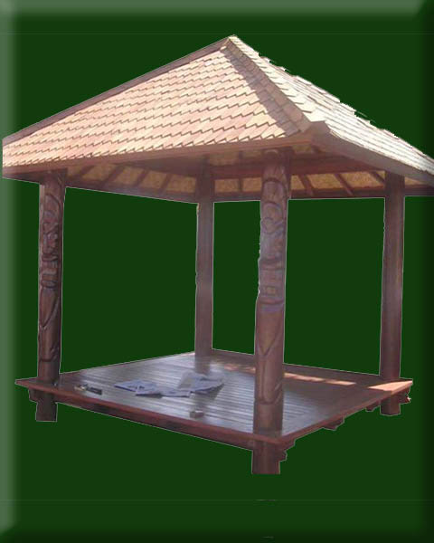 Hardwood Bali Pavillions "bale". Lanzscapes can supply these high quality imported gazbos and pavillions constructed from plantation sourced Indonesian hardwood timbers. The units are supplied in knocked down  kitset packs and are easily and quickly constructed. Contact LANZSCAPES to see the available standard unit or we can custom design to your requirements.
